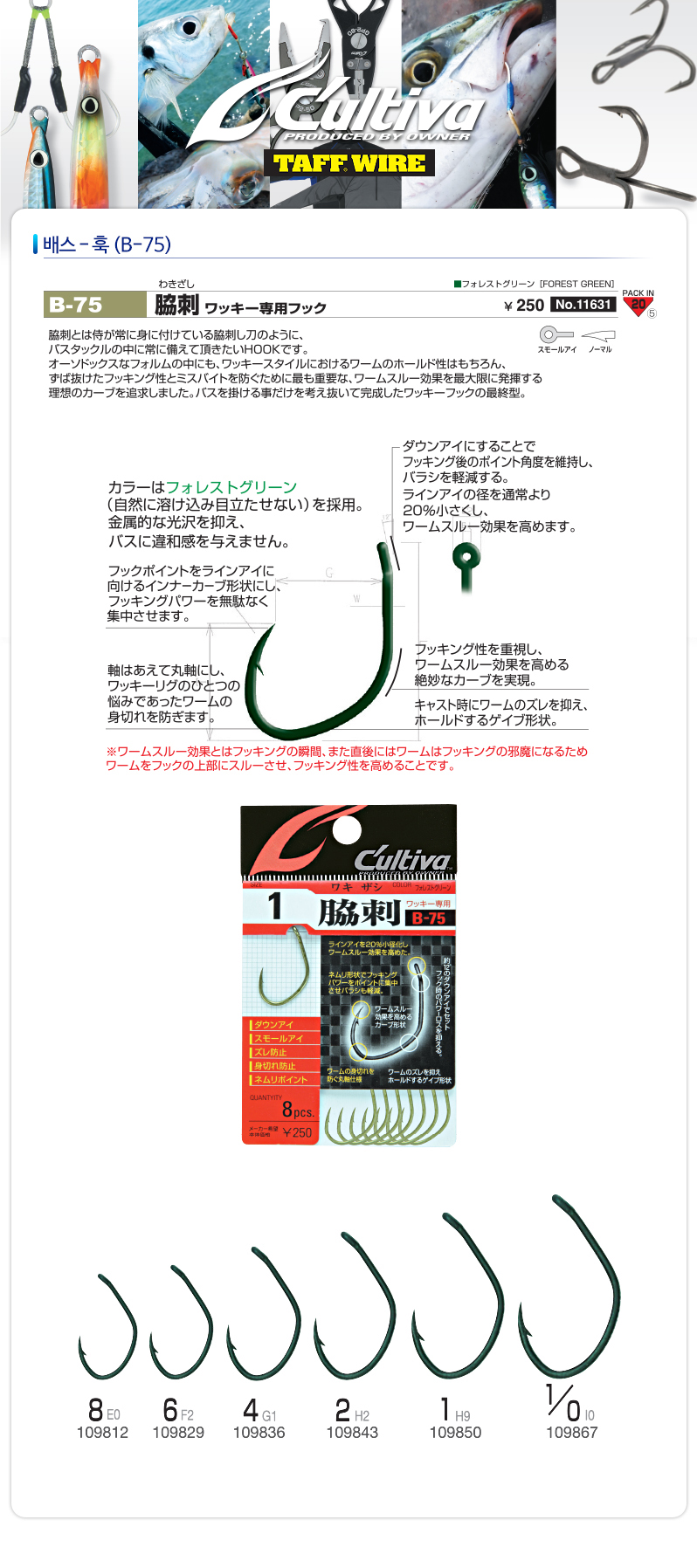 [컬티바] 배스-훅(B-75) 와키자시 루어바늘 언더리그